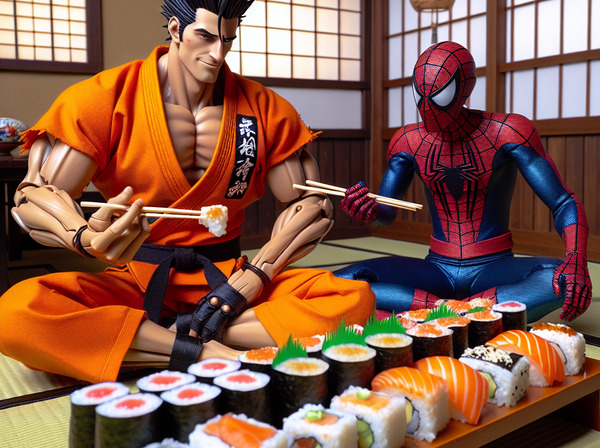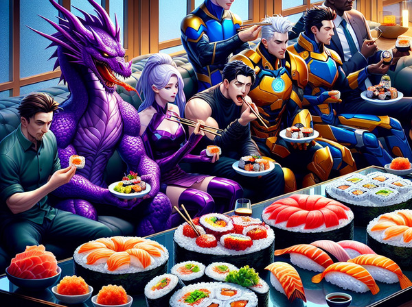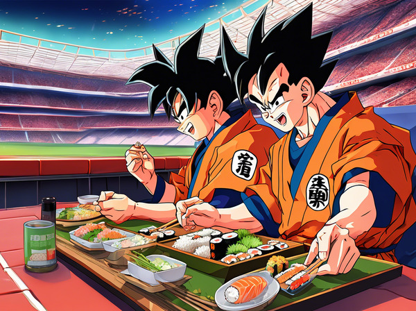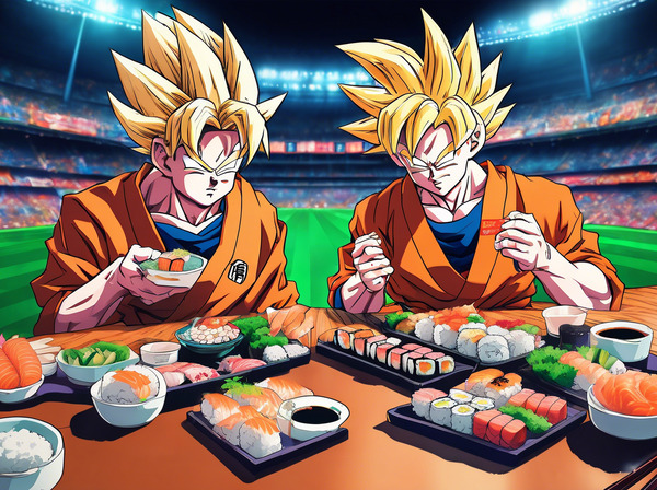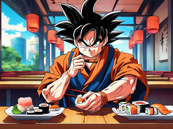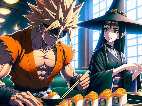 Kakarot and a Witch eating delicious Sushi in a Restaurant -