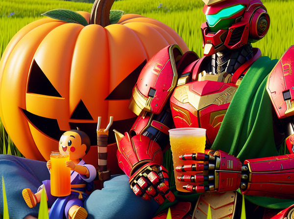 a Pumpkin and Iron Man enjoying a Drink in the Grass -