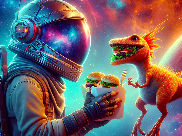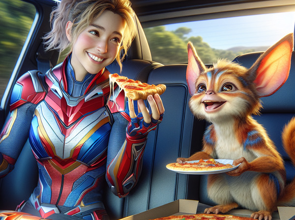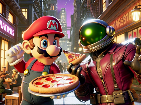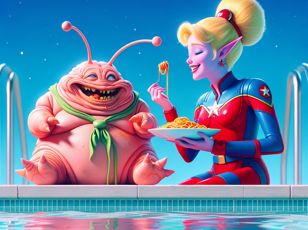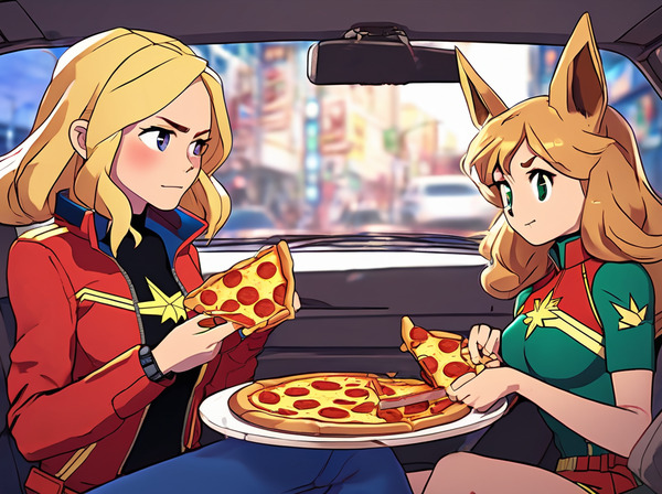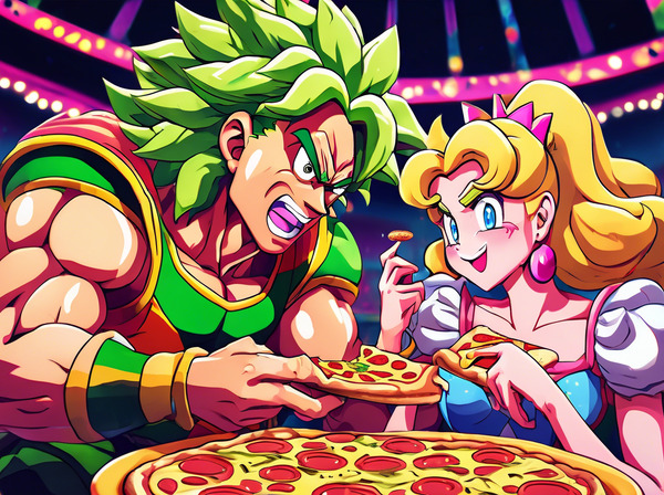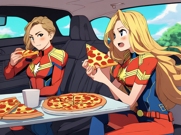 Captain Marvel and Bowser eating Pizza together on the Moon -