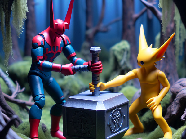 Spider-Man and Pikachu trying to lift Thors Hammer in a spooky Forest -