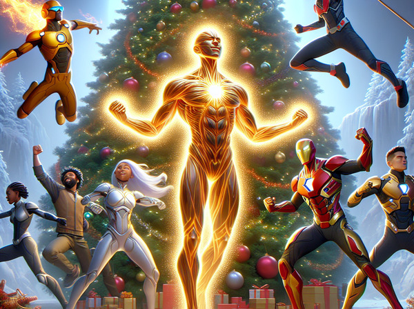 The Avengers and Vegeta going Super-Saiyan fusion at the Christmas Tree -