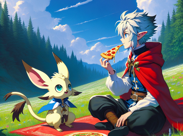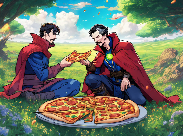 Doctor Strange and Pikachu eating Pizza together in the Meadow -