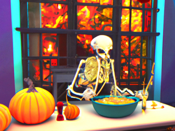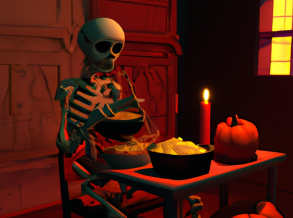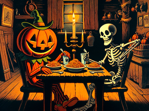 a Pumpkin and a Skeleton eating tasty Spaghetti in a spooky House -