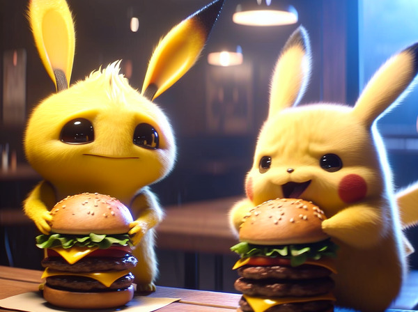 Pikachu and a Minion eating some Burgers in a Restaurant -