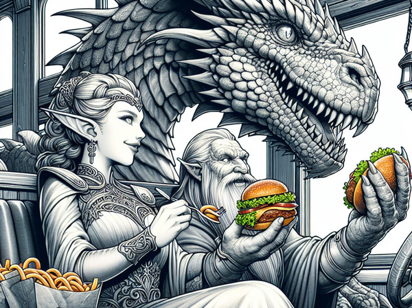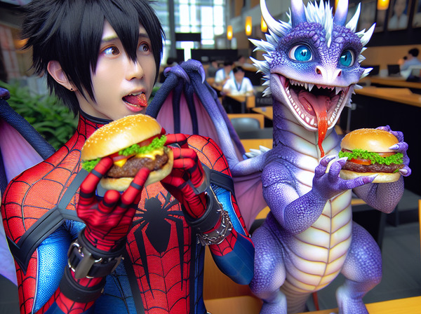 Spider-Man and Spyro the Dragon eating some Burgers in the Office -