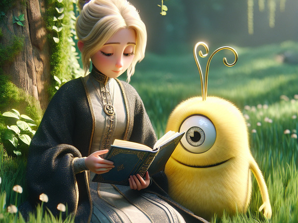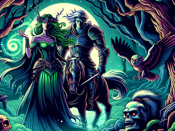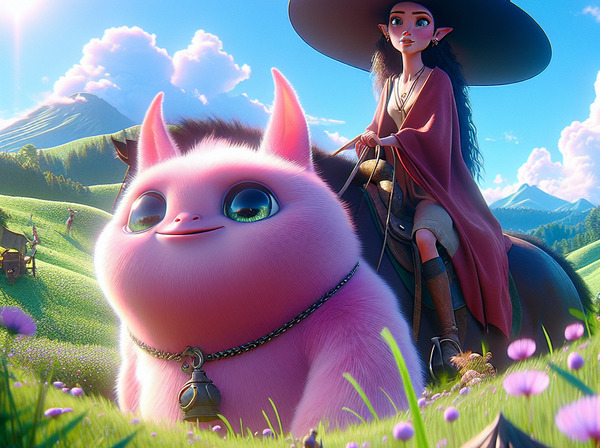 a Witch and Majin Boo riding a Horse in the Meadow -