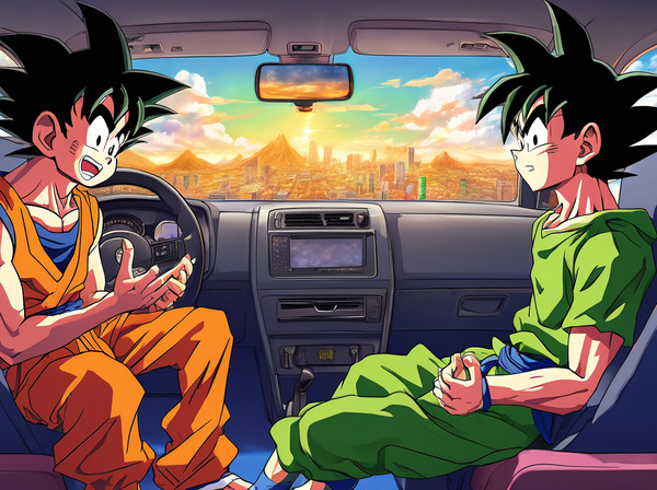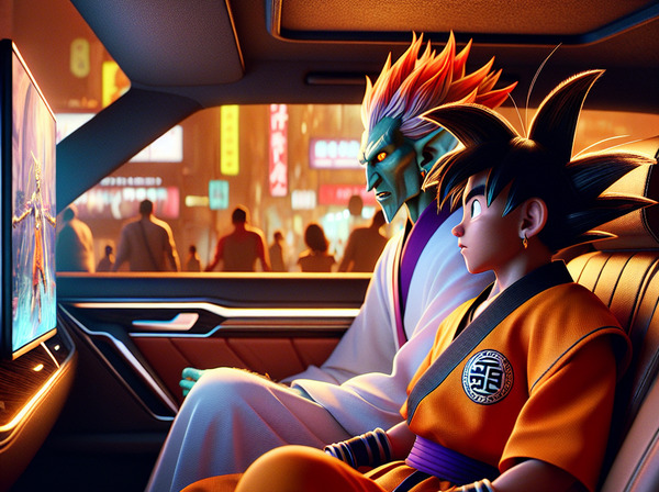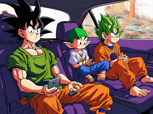 Goku and Gohan and Super Mario watching TV in a Bus -