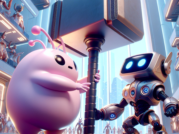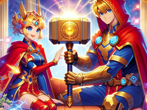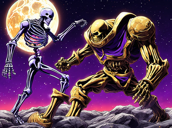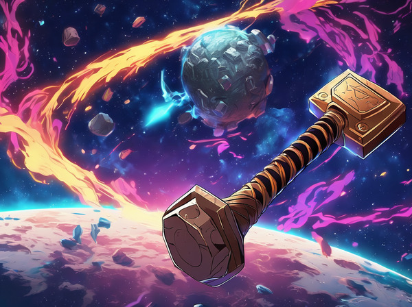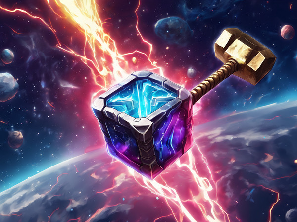 Super Mario and Link from Zelda trying to lift Thors Hammer on the Moon -
