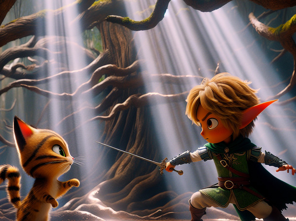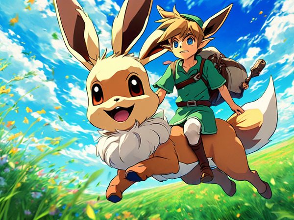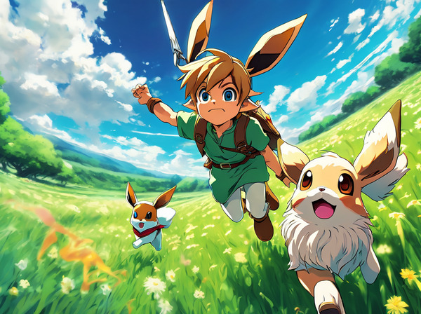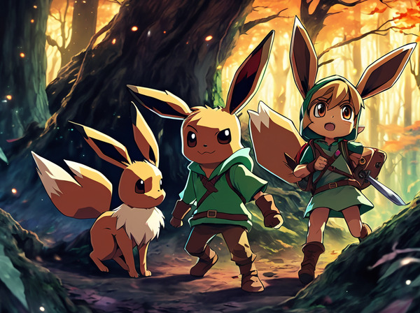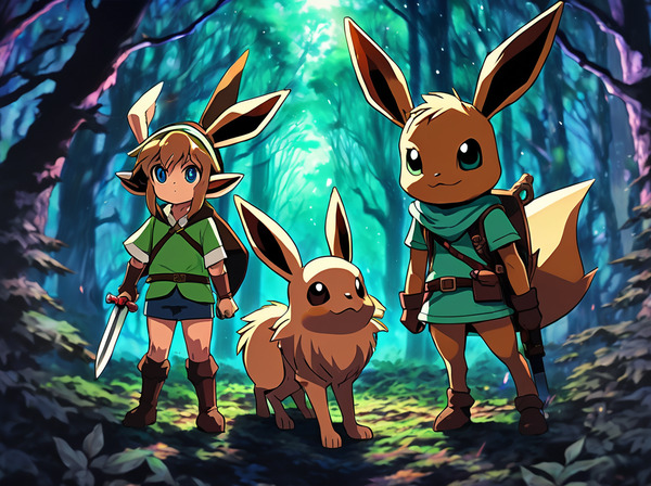 Eevee and Link from Zelda fighting against each other in a spooky Forest -