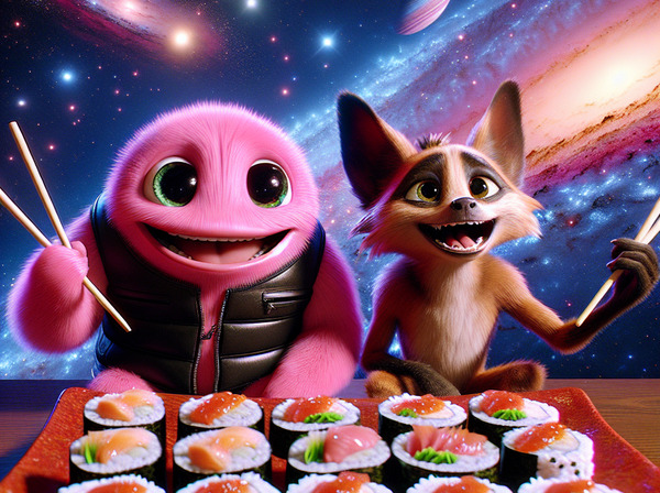 Majin Boo and Eevee eating delicious Sushi in outer Space -