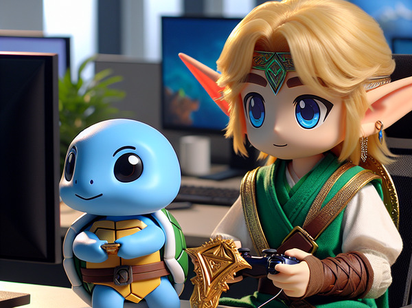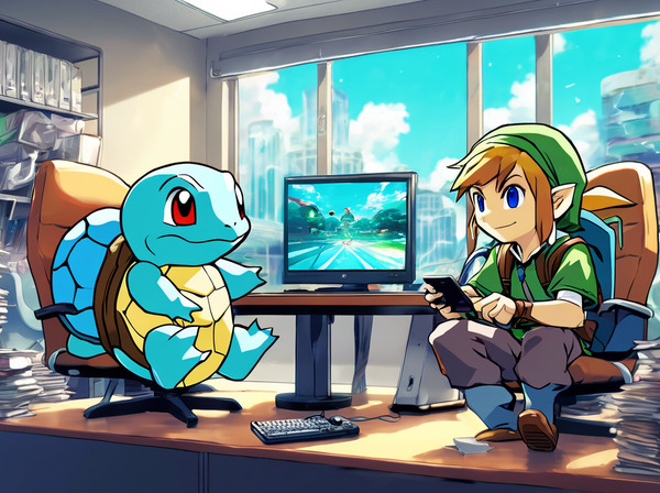 Link from Zelda and Majin Boo sunbathing with a Cocktail in the Office -