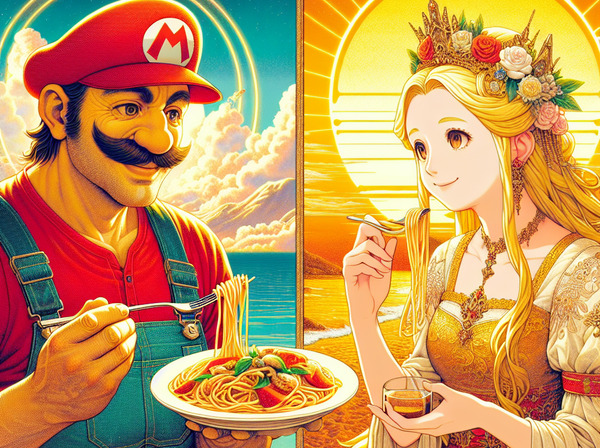 Thanos and Princess Peach going Super-Saiyan fusion in a Restaurant -