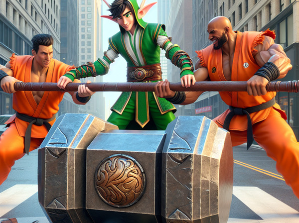 Zelda and Pikachu trying to lift Thors Hammer in the City -