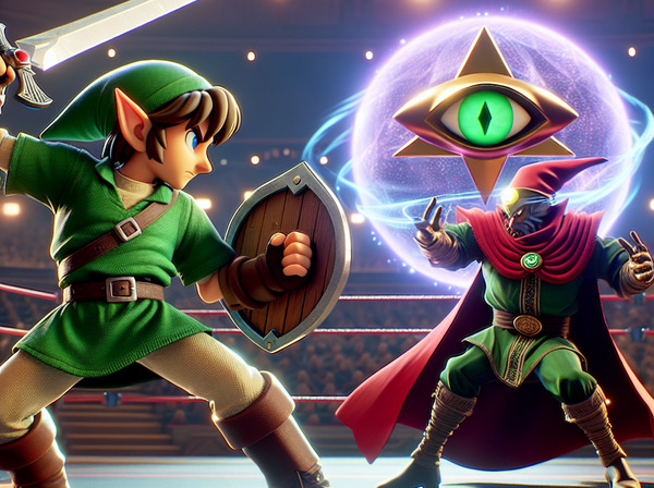 Link from Zelda and Doctor Strange fighting against each other at a Stadium -