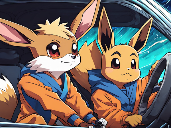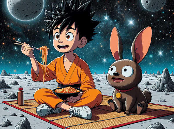 Eevee and Son Goku eating tasty Spaghetti on the Moon -