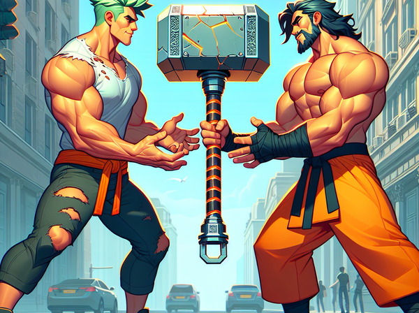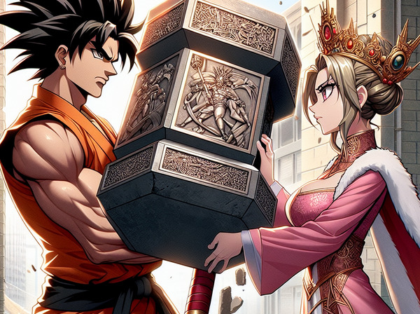 Broly and Goku trying to lift Thors Hammer on the Street -