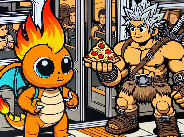 Son Goku and Pikachu eating Pizza together in a Restaurant -