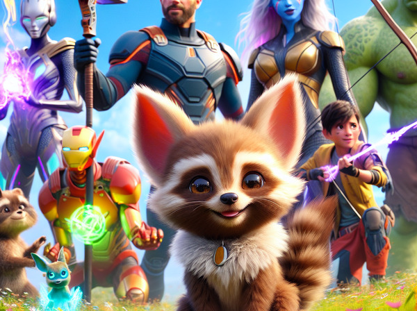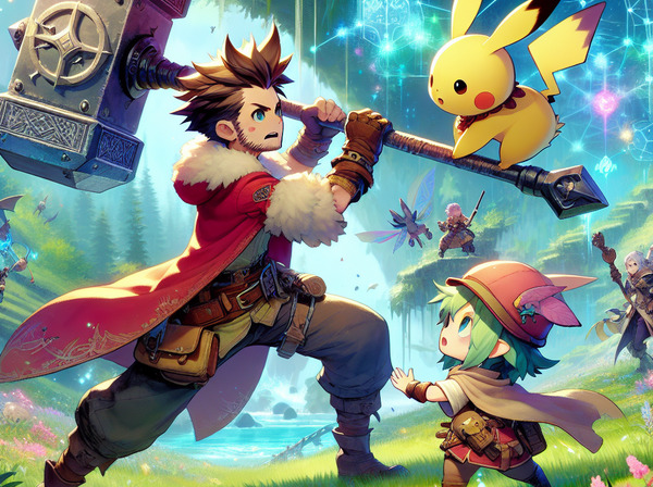 Starlord and Pikachu trying to lift Thors Hammer in the Grass -