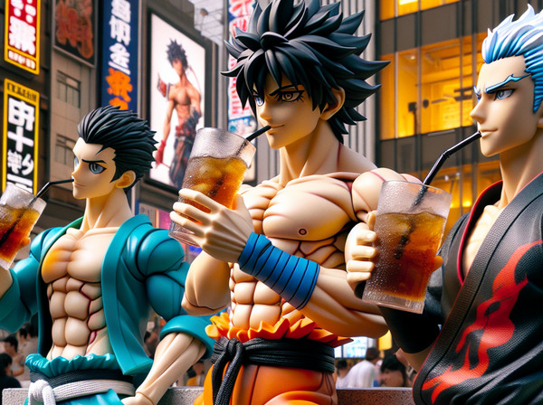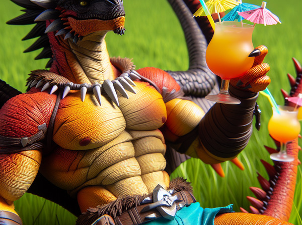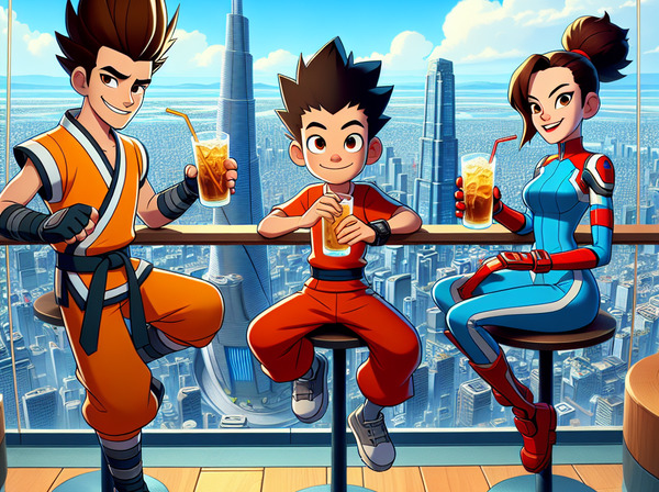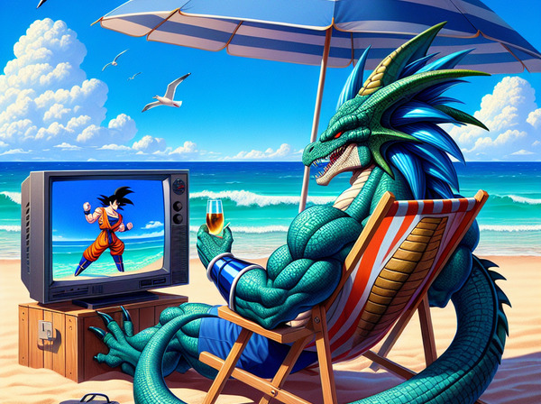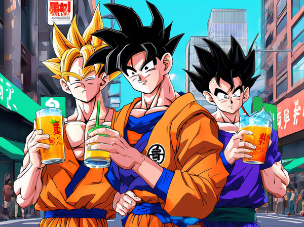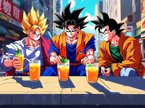 Goku and Gohan and Bowser sunbathing with a Cocktail in a Restaurant -