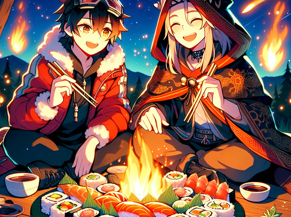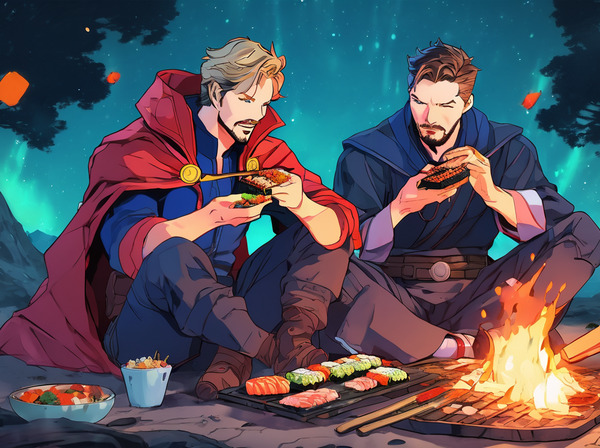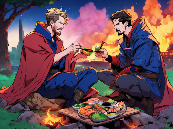Starlord and Doctor Strange eating delicious Sushi at a Campfire -