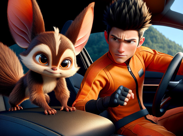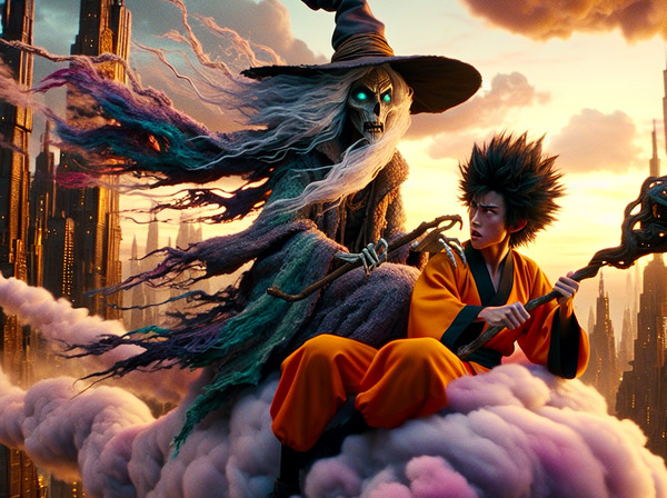 a Witch and Son Goku flying with Nimbus in a Bus -