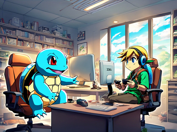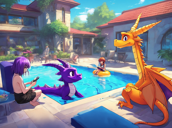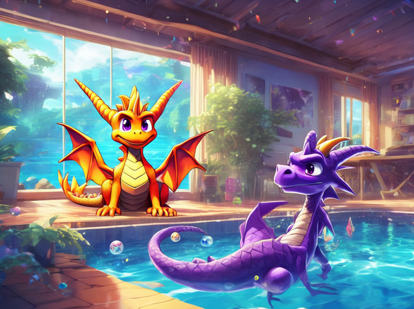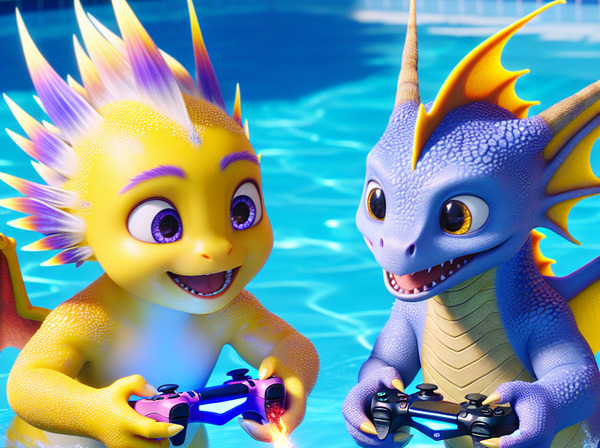 Pikachu and Spyro the Dragon playing Video Games in the Swimming Pool -