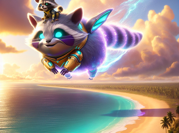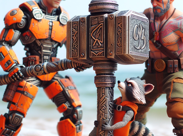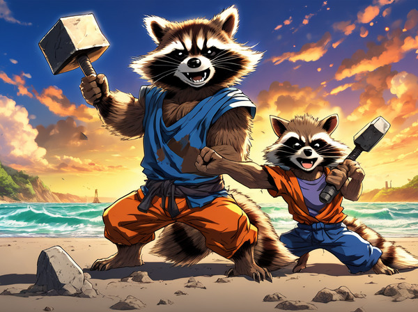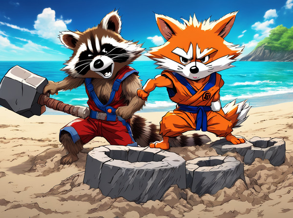 Rocket Raccoon and Goku and Gohan trying to lift Thors Hammer at the Beach -