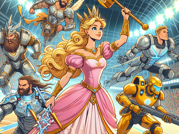 Bulbasaur and Princess Peach trying to lift Thors Hammer at the Stark Tower -