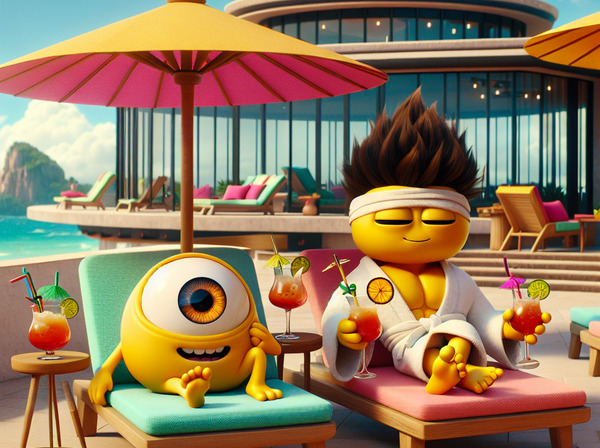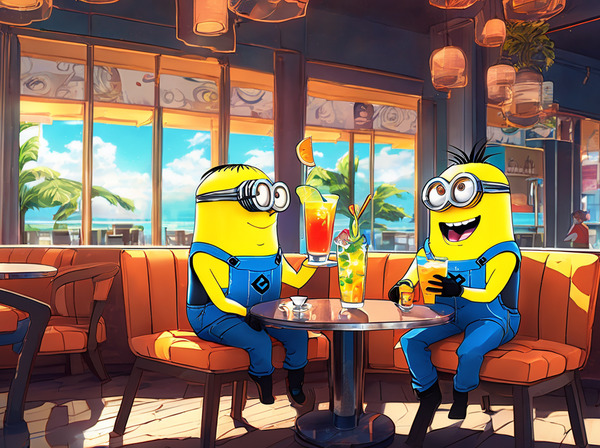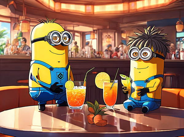 a Minion and Kakarot sunbathing with a Cocktail in a Restaurant -
