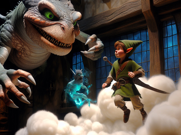 Bowser and Link from Zelda flying with Nimbus in a spooky House -