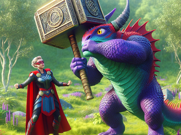 Princess Peach and Broly trying to lift Thors Hammer in the Grass -