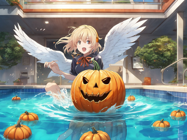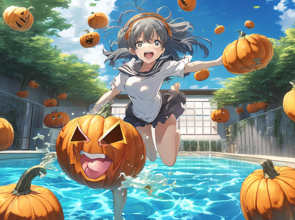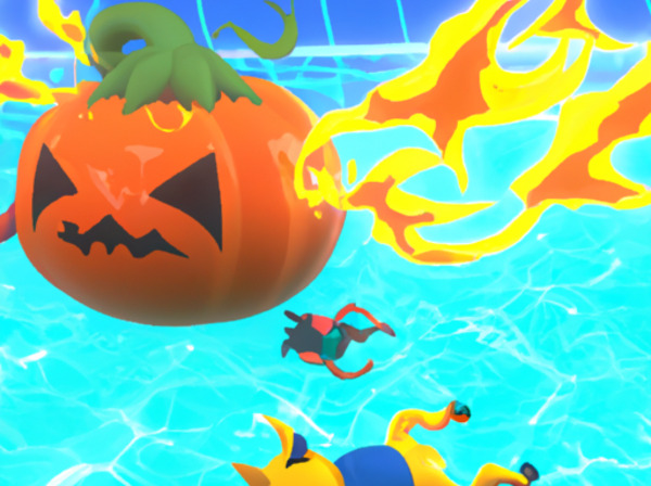 a Pumpkin and Bowser flying with Nimbus in the Swimming Pool -