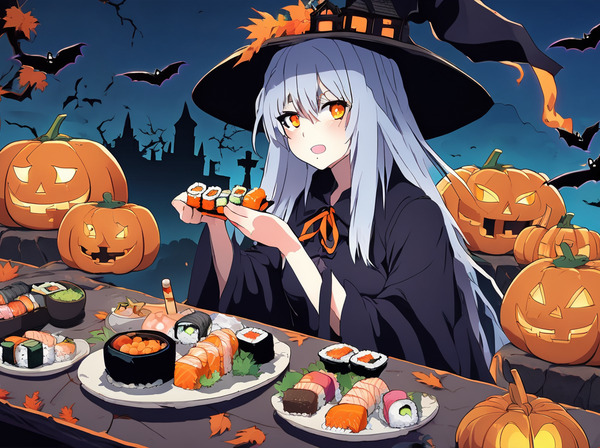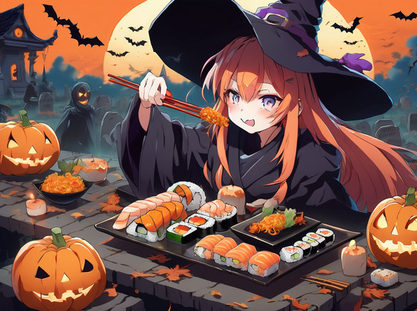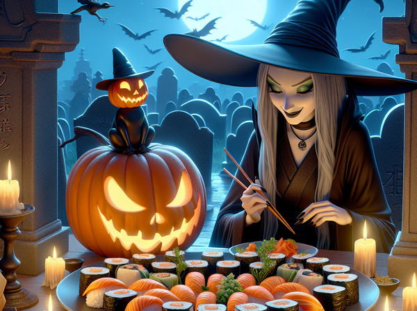 a Witch and Halloween Pumpkin eating delicious Sushi at the Graveyard -