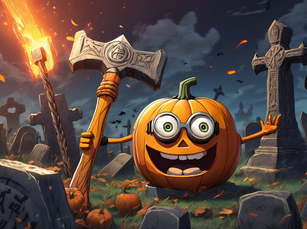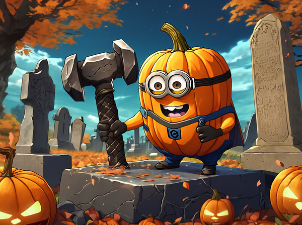 a Pumpkin and a Minion trying to lift Thors Hammer at the Graveyard -
