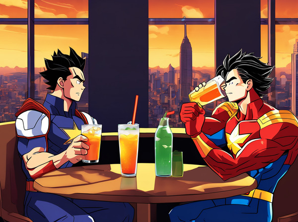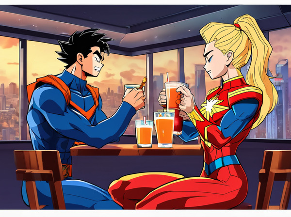 Goku and Gohan and Captain Marvel enjoying a Drink at the Stark Tower -