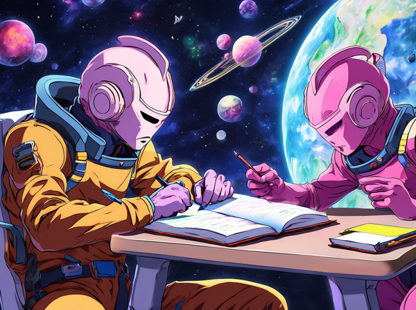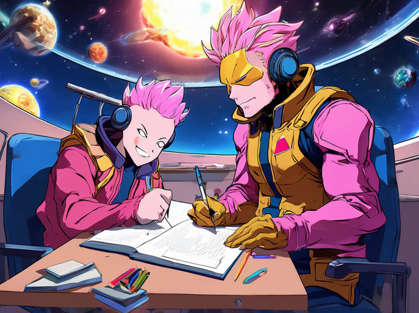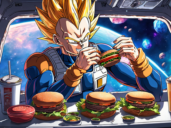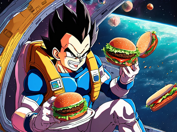 Son Goten and Trunks and Thanos eating Pizza together in outer Space -