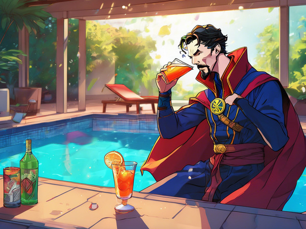 Doctor Strange and A Witch sunbathing with a Cocktail on the Couch -