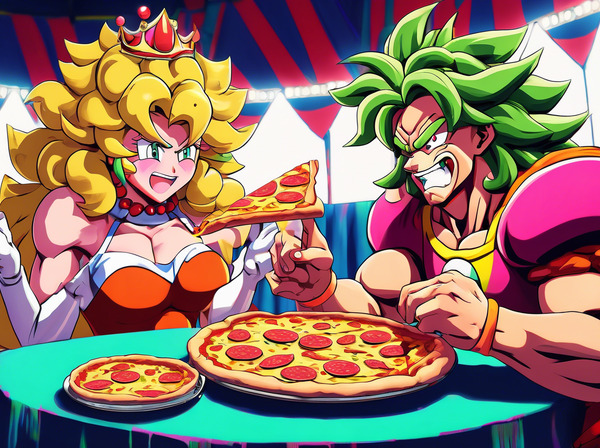 Vegeta and Rocket Raccoon eating Pizza together in a Circus -
