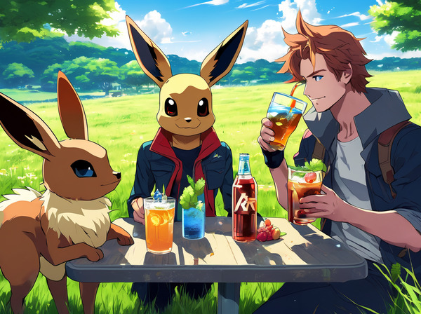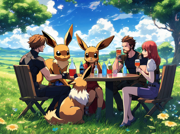 The Avengers and Eevee enjoying a Drink in the Meadow -