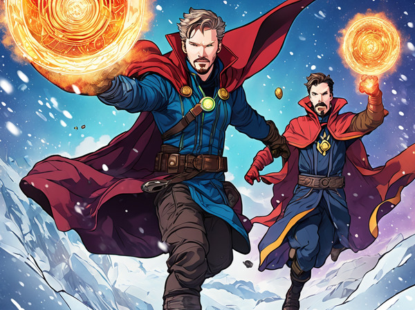 Starlord and Doctor Strange flying with Nimbus in the Snow -