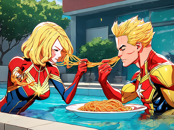 Super Mario and The Avengers eating tasty Spaghetti in the Grass -