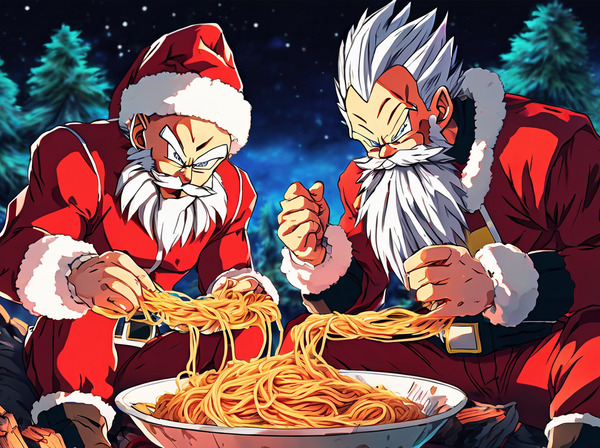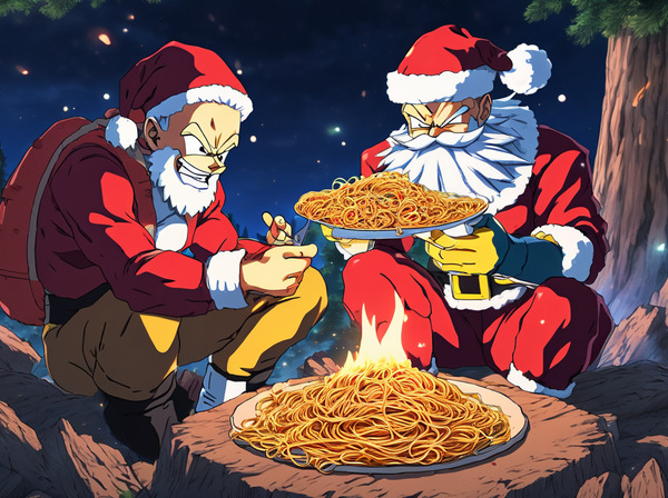 Vegeta and Santa Claus eating tasty Spaghetti at a Campfire -