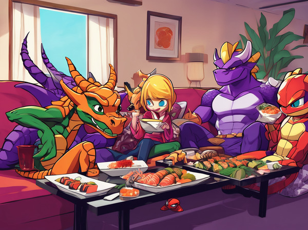 Spyro the Dragon and The Avengers eating delicious Sushi on the Couch -