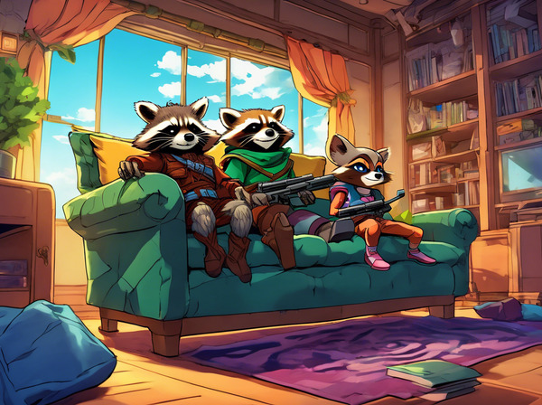 Rocket Raccoon and Thanos fighting against each other on the Couch -